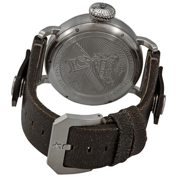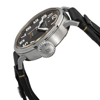 Silver-tone stainless steel case with a black (aged calfskin) leather strap. Fixed silver-tone stainless steel bezel. Slate grey (sunray pattern) dial with luminous silver-tone hands and Arabic numeral hour markers. Minute markers around the outer rim. Dial Type: Analog. Luminescent hands and markers. Zenith Calibre Elite automatic movement with a 50-hour power reserve. Scratch resistant sapphire crystal. Pull / push crown. Solid case back. Round case shape, case size: 45 mm, case thickness: 12.95 mm. Band width: 20 mm. Tang clasp. Water resistant at 100 meters / 330 feet. Functions: hour, minute, second. Pilot Type 20 Series. Luxury watch style. Watch label: Swiss Made. Zenith Pilot Type 20 Automatic Men's Watch 03.2434.679/20.I010.