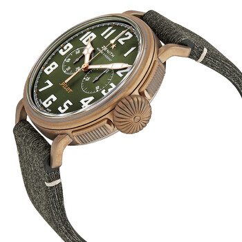 Bronze case with a green (calfskin) leather (protective rubber) strap. Fixed bronze bezel. Khaki green grained dial with luminous rose gold-tone hands and Arabic numeral hour markers. Minute markers around the outer rim. Dial Type: Analog. Luminescent hands and markers. Chronograph - two sub-dials displaying: 60 second and 30 minute. Zenith Calibre 4069 automatic movement with a 50-hour power reserve. Scratch resistant sapphire crystal. Solid case back. Round case shape. Case size: 45 mm. Case thickness: 14.25 mm. Band width: 23 mm / 21 mm. Tang clasp. Water resistant at 100 meters / 330 feet. Functions: chronograph, hour, minute, second. Pilot Type 20 Series. Luxury watch style. Watch label: Swiss Made. Zenith Pilot Type 20 Chronograph Automatic Men's Watch 29.2430.4069/63.I001.