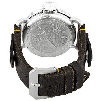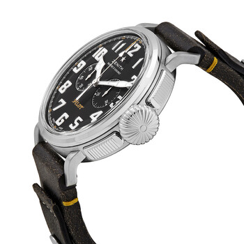 Silver-tone stainless steel case with a black (calfskin) leather strap. Fixed silver-tone stainless steel bezel. Slate grey sunray dial with luminous silver-tone hands and Arabic numeral hour markers. Arabic numeral minute markers (at 5 minute intervals). Minute markers around the outer rim. Dial Type: Analog. Luminescent hands and markers. Chronograph - two sub-dials displaying: 60 second and 30 minute. Automatic movement with a 50-hour power reserve. Scratch resistant sapphire crystal. Pull / push crown. Transparent case back. Round case shape, case size: 45 mm, case thickness: 14.25 mm. Band width: 20 mm. Tang clasp. Water resistant at 100 meters / 330 feet. Functions: chronograph, hour, minute, second. Pilot Type 20 Chronograph Recue Series. Luxury watch style. Watch label: Swiss Made. ZENITH Pilot Type 20 Chronograph Rescue Automatic Men's Watch 03.2434.4069/20.I010.