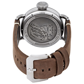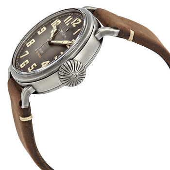 Black ruthenium-plated stainless steel case with a brown oily nubuck leather leather strap (with a protective rubber lining). Fixed black ruthenium-plated stainless steel bezel. Slate grey dial with grey cathedral-style hands and Arabic numeral hour markers. Minute markers around the outer rim. Dial Type: Analog. Luminescent hands and markers. Zenith caliber Elite 679 automatic movement, based upon Zenith 680, containing 26 Jewels, bitting at 28800 vph, and has a power reserve of approximately 55 hours. Scratch resistant sapphire crystal. Solid case back. Round case shape. Case size: 45 mm. Case thickness: 14.25 mm. Band width: 19 mm. Tang clasp. Water resistant at 100 meters / 330 feet. Functions: hour, minute, second. Pilot type 20 ton up series. Pilot watch style. Watch label: Swiss Made. Zenith Pilot Type 20 Ton Up Automatic Men's Watch 11.2430.679/21.C801.