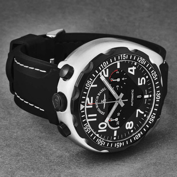 Stainless steel case with a black leather strap. Fixed stainless steel bezel with a black-plated top ring. Black dial with luminous silver-tone hands and Arabic numeral hour markers. Arabic numeral minute markers (at 5 minute intervals). Minute markers around the outer rim. Dial Type: Analog. Luminescent hands and markers. Date display above the 6 o'clock position. Chronograph - two sub-dials displaying: 30 minute and 12 hours. Automatic movement. Scratch resistant sapphire crystal. Skeleton case back. Round case shape. Case size: 47 mm. Case thickness: 18 mm. Band length: 8 inches. Tang clasp. Water resistant at 300 meters / 1000 feet. Functions: chronograph, date, hour, minute, second. Pilot Bulhed Series. Luxury watch style. Watch label: Swiss Made. Zeno Pilot bulhed Chronograph Automatic Black Dial Men's Watch 6528-THD-A1.