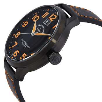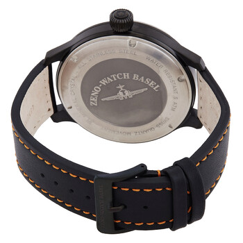 Black stainless steel case with a black- orange stitching leather strap. Fixed black stainless steel bezel. Black dial with white, with a orange luminescent fill hands and orange Arabic numerals hour markers. Minute markers around the outer rim. Dial Type: Analog. Date display at the 12 o'clock position. Ronda Caliber 7003.L quartz movement. Scratch resistant sapphire crystal. Pull / push crown. Stainless steel, screw-down case back. Round case shape, case size: 55 mm, case thickness: 15 mm. Band width: 24 mm, band length: 8 inches. Buckle clasp. Water resistant at 50 meters / 165 feet. Functions: date, hour, minute, second. Sos series. Casual watch style. Watch label: Swiss Made. Zeno Sos Quartz Black Dial Men's Watch 6221-7003-BKA15.
