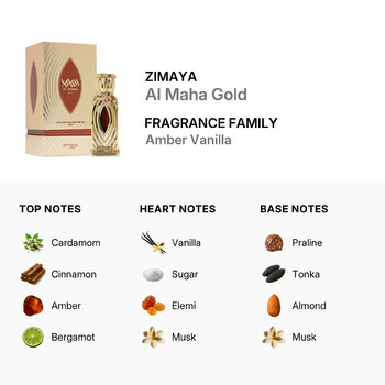 Al Maha Gold belongs to the Amber Vanilla fragrance family, delivering a smooth and inviting scent journey. The top notes open with a vibrant mix of cardamom, cinnamon, amber, and bergamot, creating a spicy-sweet introduction that instantly captures attention. As the scent unfolds, heart notes of creamy vanilla, sugary sweetness, elemi, and soft musk blend together for a cozy, comforting feel.