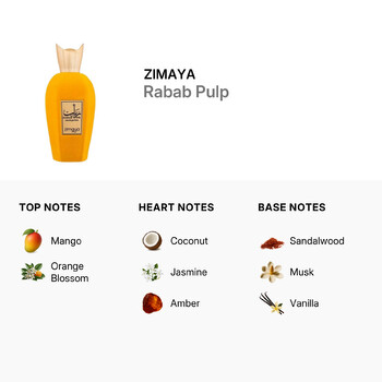 Rabab Pulp opens with a juicy burst of mango and the delicate sweetness of orange blossom, creating a bright and tropical introduction. As the scent evolves, warm heart notes of creamy coconut, sensual jasmine, and golden amber add depth and richness, wrapping the senses in a soft, sun-kissed glow. Finally, the base notes of smooth sandalwood, soft musk, and comforting vanilla leave a long-lasting trail that’s both cozy and sophisticated.