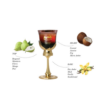 Bahiya Garnet opens with a vibrant burst of fruity top notes including juicy mango, sweet pear, ripe cherry, zesty bergamot, and bright mandarin. This inviting combination creates a fresh and playful introduction that instantly captures attention.