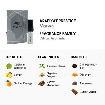 The base of Marwa leaves a lasting mark, featuring rich notes of Chinese black tea, olibanum, ambroxan, and guaiac wood. These grounding elements create a smooth, smoky finish that lingers on the skin, offering a bold and confident aura. The luxurious ingredients reflect Arabiyat Prestige’s dedication to quality and artistry in scent creation.