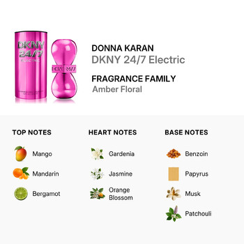 Part of the Amber Floral fragrance family, DKNY 24/7 Electric opens with juicy top notes of mango, mandarin, and bergamot that awaken the senses from the very first spray. At its heart, elegant gardenia, jasmine, and orange blossom bloom with a lush, feminine charm. The base is rich and grounding, featuring sensual layers of vanilla, sandalwood, incense, musk, papyrus, patchouli, benzoin, and soft moss, creating a long-lasting impression that lingers beautifully.