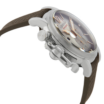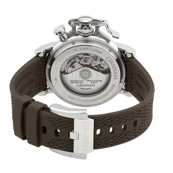 Silver-tone stainless steel case with a green rubber strap. Fixed silver-tone stainless steel bezel. Silver-tone dial with gold-tone hands and Arabic & index hour markers. Minute scale around the inner rim. Dial Type: Analog. Luminescent hands and markers. Date display at the 9 o'clock position. Chronograph - two sub-dials displaying: 60 second and 30 minute. Graham Calibre G1747 Automatic movement, based upon ETA 7750, containing 25 Jewels, bitting at 28800 vph, and has a power reserve of approximately 42 hours. Scratch resistant sapphire crystal. Pull / push crown. Transparent case back. Round case shape, case size: 47 mm. Water resistant at 100 meters / 330 feet. Functions: chronograph, date, hour, minute, small second. Chronofighter Grand Vintage Series. Sport watch style. Watch label: Swiss Made. Graham Chronofighter Grand Vintage Chronograph Automatic Silver Dial Unisex Watch 2CVDS.S02A.