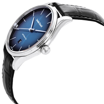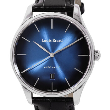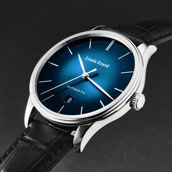 Silver-tone stainless steel case with a black leather strap. Fixed silver-tone stainless steel bezel. Blue dial with silver-tone hands and index hour markers. Dial Type: Analog. Date display at the 6 o'clock position. Sellita SW200-1 automatic movement. Scratch resistant sapphire crystal. Pull / push crown. Transparent case back. Round case shape, case size: 41 mm, case thickness: 11 mm. Band width: 20 mm, band length: 8 inches. Tang clasp. Water resistant at 50 meters / 165 feet. Functions: date, hour, minute, second. Heritage Series. Luxury watch style. Watch label: Swiss Made. Louis Erard Heritage Automatic Blue Dial Men's Watch 69287AA65.BAAC82.