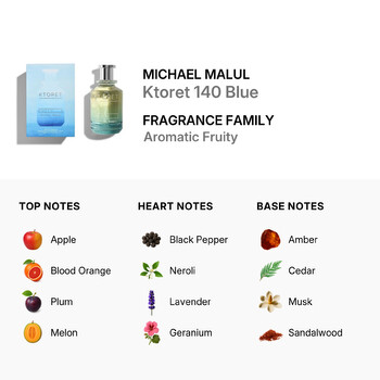Part of the Aromatic Fruity family, Ktoret 140 Blue opens with a vibrant burst of juicy apple, blood orange, plum, melon, and pomelo. These top notes create a lively and refreshing first impression that captures attention instantly. As the scent unfolds, heart notes of spicy black pepper blend with smooth neroli, calming lavender, and crisp geranium, adding warmth and balance to the fragrance's core.