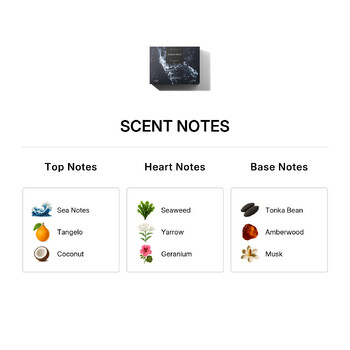 As the fragrance unfolds, a blend of sea kelp, yarrow, and crisp geranium adds a smooth, herbal twist. These clean, green middle notes balance the sweetness of the top, giving Ocean Noir a refined yet adventurous heart that stands out in any setting—from beachside afternoons to evening outings.