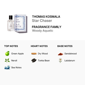 Launch year: 2024. Fragrance Family: Woody Aquatic. Top notes: Green apple, Neroli, Sea notes. Heart notes: Dry wood, Tonka bean. Base notes: Sandalwood, Labdanum. Design house: Thomas Kosmala. Design house category: niche fragrance brand. Scent name: Star Chaser. Gender: Unisex. Category: Fragrance. SubType: EDP Spray. Size: 3.38 oz. Barcode: 5060412111065. Thomas Kosmala Unisex Star Chaser EDP Spray 3.38 oz Fragrances 5060412111065.