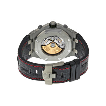 Pre-owned Silver-tone stainless steel case with a black hornback alligator leather strap. Fixed silver-tone stainless steel bezel. Black mega tapisserie dial with silver-toned hands and Arabic hour markers. Minute markers. tachymeter markings around the outer rim. Dial Type: Analog. Luminescent hands and markers. Date display at the 3 o'clock position. Chronograph - three sub-dials displaying: 60 second, 30 minute and 12 hour. Audemars Piguet Calibre 3126/3840 Automatic movement, based upon Audemars Piguet 3120, containing 59 Jewels, composed of 365 parts, bitting at 21600 vph, and has a power reserve of approximately 50 hours. Scratch resistant sapphire crystal. Pull / push crown. Skeleton case back. Octagon case shape, case size: 42 mm, case thickness: 14.54 mm. Tang clasp. Water resistant at 100 meters / 330 feet. Functions: chronograph, date, hour, minute, small second. Luxury watch style. Watch label: Swiss Made. Item Variations: 26470ST OO A101CR 01, 26470ST-OO-A101CR-01, 26470STOOA101CR01. Audemars Royal Oak Offshore Black Dial Black Alligator Leather Men's Watch 26470STOOA101CR01.