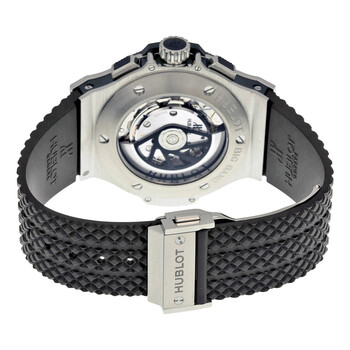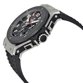 Pre-owned Stainless steel case with lateral black Kevlar inserts and a black rubber strap. Fixed black ceramic bezel. Black carbon fiber pattern dial with luminous skeleton hands and alternating Arabic numeral and index hour markers. Minute markers around the outer rim. Dial Type: Analog. Luminescent hands and markers. Date display between the 4 and 5 o'clock positions. Chronograph - three sub-dials displaying: 60 second, 30 minute and 12 hour. Hublot calibre HUB4100 automatic movement, based upon ETA 2894-2, containing 27 Jewels, composed of 252 parts, bitting at 28800 vph, and has a power reserve of approximately 42 hours. Scratch resistant sapphire crystal. Pull / push crown. Transparent case back. Round case shape. Case size: 44 mm. Case thickness: 14.5 mm. Band width: 25 mm. Band length: 8 inches. Fold over clasp with a push button release. Water resistant at 100 meters / 330 feet. Functions: chronograph, date, hour, minute, second. Sport watch style. Watch label: Swiss Made. Item Variations: 301.SB.131.RX, 301-SB-131-RX, 301/SB/131/RX, 301SB131RX. Hublot Big Bang Steel Ceramic Men's Watch 301.SB.131.RX.