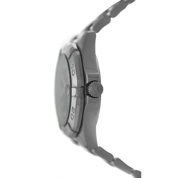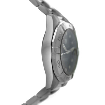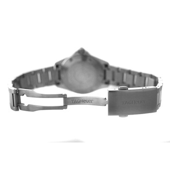 Silver-tone stainless steel case and bracelet. Uni-directional rotating silver-tone stainless steel bezel. Black dial with silver-tone hands and diamond hour markers. Minute markers around the outer rim. Dial Type: Analog. Luminescent hands and markers. Date display at the 3 o'clock position. Tag Heuer Calibre 9 Automatic movement, based upon Sellita SW1000-1, containing 18 Jewels, bitting at 28800 vph, and has a power reserve of approximately 40 hours. Scratch resistant sapphire crystal. Pull / push crown. Solid case back. Round case shape, case size: 32 mm. Band length: 7.5 inches. Fold over clasp with a safety release. Water resistant at 300 meters / 1000 feet. Functions: date, hour, minute, second. Aquaracer Series. Dive watch style. Watch label: Swiss Made. Item Variations: WBD2312. Pre-owned Tag Heuer Aquaracer Automatic Diamond Black Dial Ladies Watch WBD2312.BA0740.
