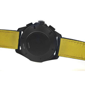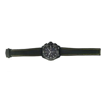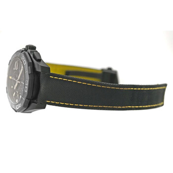 Black titanium case with a black textile strap. Uni-directional rotating black titanium bezel. Black dial with silver-tone hands and Arabic numeral & index hour markers. Minute markers around the outer rim. Dial Type: Analog. Luminescent hands and markers. Date display at the 3 o'clock position. Chronograph - three sub-dials displaying: 60 second, 30 minute and 12 hour. Tag Heuer Calibre 16 Automatic movement, based upon Valjoux 7750, containing 25 Jewels, bitting at 28800 vph, and has a power reserve of approximately 42 hours. Scratch resistant sapphire crystal. Screw down crown. Solid case back. Dodecagon case shape, case size: 43 mm. Band length: 8.5 inches. Deployment with push button release clasp. Water resistant at 300 meters / 1000 feet. Functions: chronograph, date, day, hour, minute, small second. Aquaracer Series. Dive watch style. Watch label: Swiss Made. Item Variations: CAY218A, CAY218A FC6361, CAY218A-FC6361, CAY218A/FC6361, CAY218AFC6361. Pre-owned Tag Heuer Aquaracer Chronograph Automatic Black Dial Men's Watch CAY218A.FC6361.