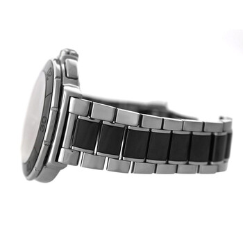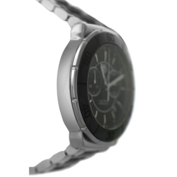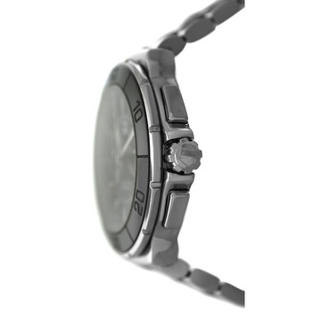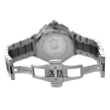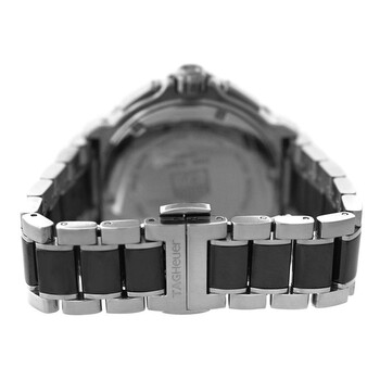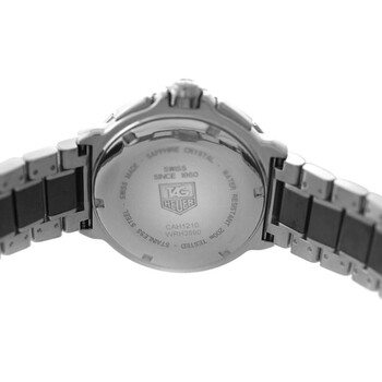 Silver-tone stainless steel case with a two-tone (black and silver-tone) stainless steel and ceramic bracelet. Black ceramic bezel. Black dial with silver-tone hands and Arabic numeral & index hour markers. Minute markers around the outer rim. Dial Type: Analog. Luminescent hands and markers. Date display between 4 and 5 o'clock position. Chronograph - two sub-dials displaying: 60 second and 30 minute. Quartz movement. Scratch resistant sapphire crystal. Screw down crown. Solid case back. Round case shape, case size: 41 mm. Band length: 6 inches. Fold over clasp with a safety release. Water resistant at 200 meters / 660 feet. Functions: chronograph, date, hour, minute, second. Formula 1 Series. Luxury watch style. Watch label: Swiss Made. Item Variations: CAH1210, CAH1210-BA0862, CAH1210BA0862, CAH1210/BA0862, CAH1210 BA0862. Pre-owned Tag Heuer Formula 1 Chronograph Quartz Black Dial Ladies Watch CAH1210.BA0862.