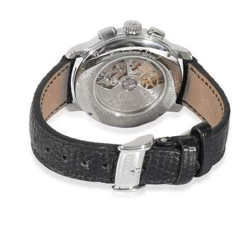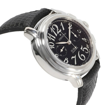 Silver-tone stainless steel case with a black lizard band. Fixed silver-tone stainless steel bezel. Blue dial with silver-tone hands and Arabic numeral hour markers. Minute markers around the outer rim. Dial Type: Analog. Date display between 4 and 5 o'clock position. Chronograph - two sub-dials displaying: 60 second and 30 minute. Automatic movement. Scratch resistant sapphire crystal. Transparent see through case back. Round case shape, case size: 37.5 mm, case thickness: 14.00 mm. Band width: 18 mm, band length: 6.25 inches. Buckle clasp. Functions: chronograph, date, hour, minute, second. El Primero Chronomaster Star Series. Sport watch style. Watch label: Swiss Made. Pre-owned Zenith El Primero Chronomaster Star Chronograph Automatic Blue Dial Unisex Watch 03.1230.4002.