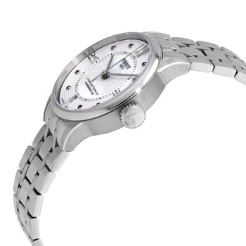 Stainless steel case with a stainless steel bracelet. Fixed stainless steel bezel. White mother of pearl dial with silver-tone sword-shaped hands and red ruby hour markers. Roman numerals mark the 3, 9 and 12 o'clock positions. Minute markers around an inner ring. Dial Type: Analog. Date display at the 6 o'clock position. Powermatic 80.111 automatic movement, containing 23 Jewels, bitting at 28800 vph, and has a power reserve of approximately 80 hours. Scratch resistant sapphire crystal. Pull / push crown. Transparent case back. Round case shape. Case size: 32 mm. Case thickness: 10.7 mm. Band width: 16 mm. Fold over clasp with a push button release. Water resistant at 50 meters / 165 feet. Functions: date, hour, minute, second. Dress watch style. Watch label: Swiss Made. Tissot Chemin Des Tourelles White Mother of Pearl Rubies Dial Ladies Watch T099.207.11.113.00.